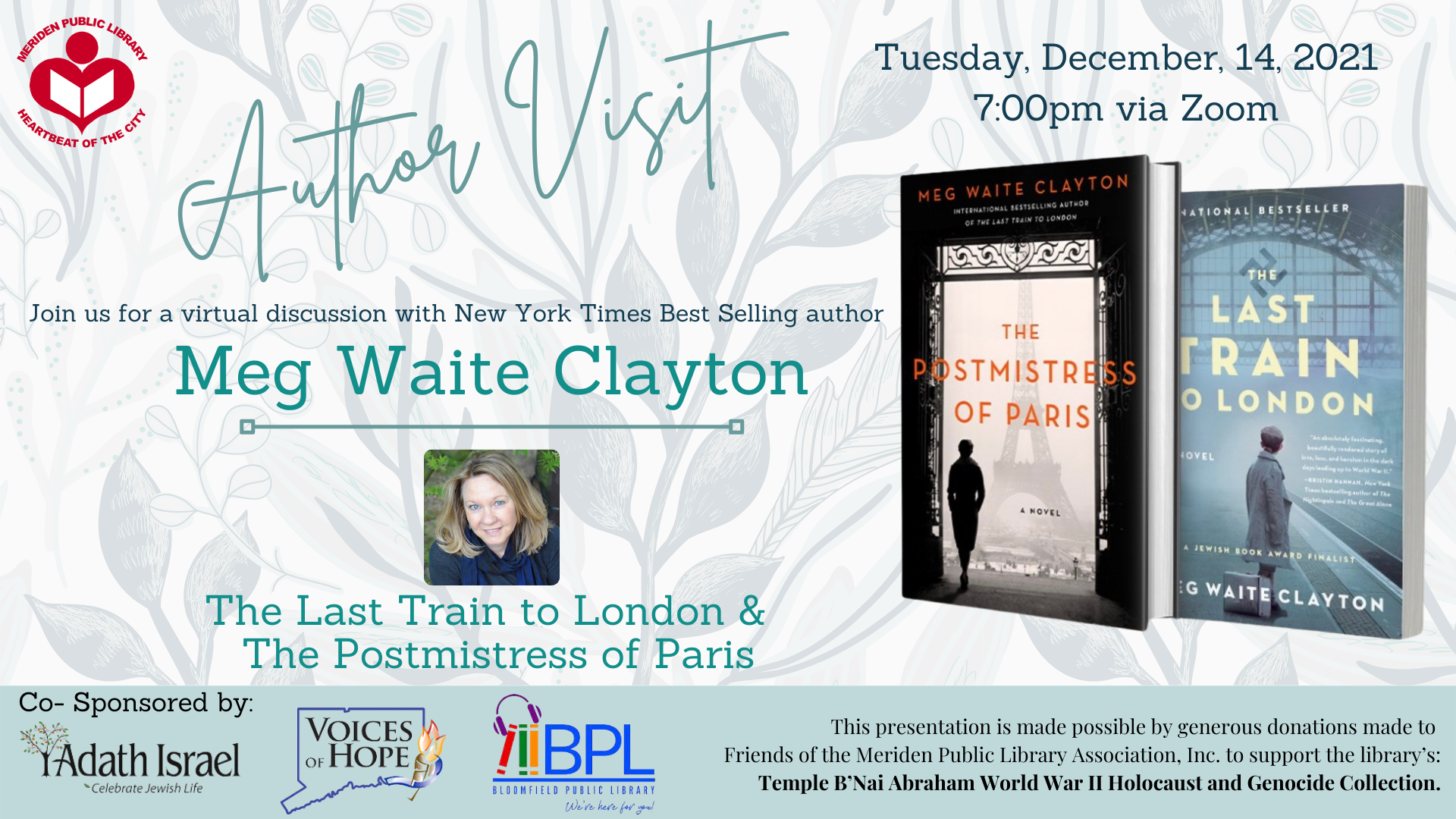 Join us for a virtual discussion with New York Times best selling author, Meg Waite Clayton. Don't miss out on this opportunity to dive deeper into her novels The Last Train to London and The Postmistress of Paris.
