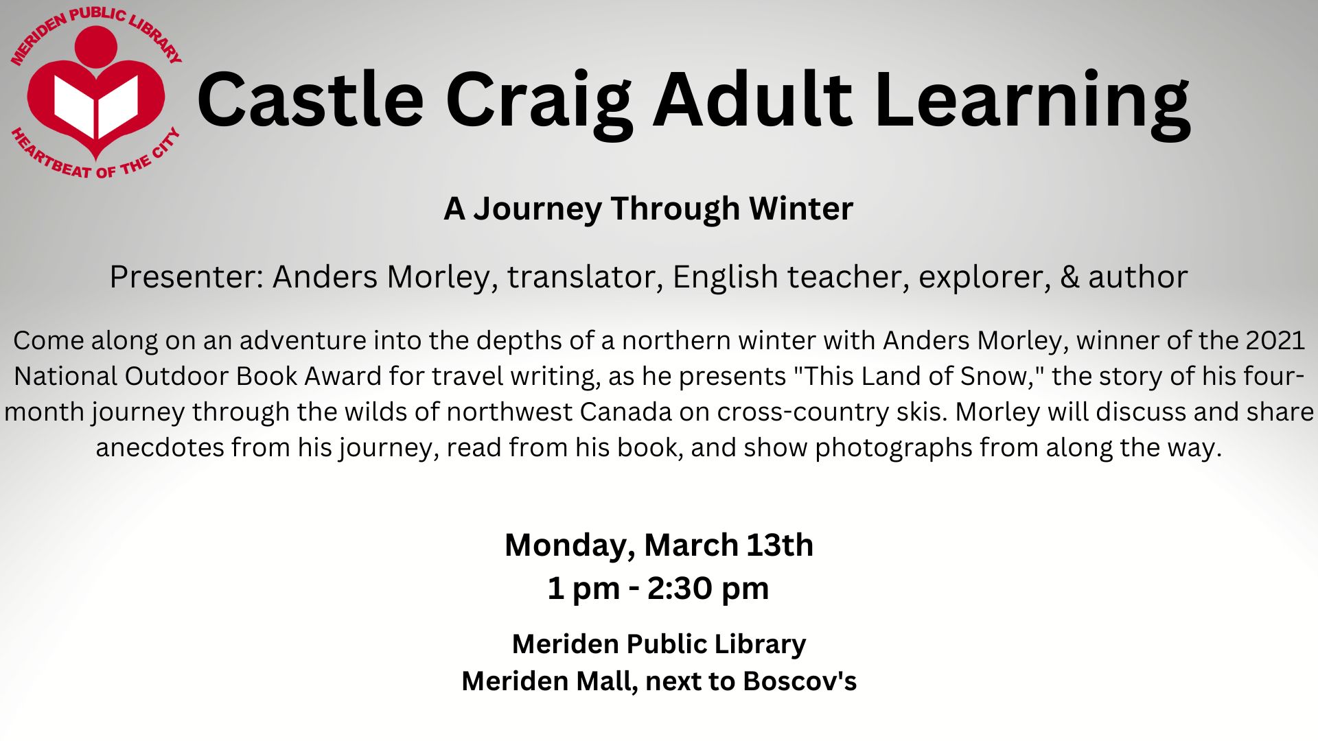 Come along on an adventure into the depths of a northern winter with Anders Morley, winner of the 2021 National Outdoor Book Award for travel writing, as he presents "This Land of Snow," the story of his four-month journey through the wilds of northwest Canada on cross-country skis. Morley will discuss and share anecdotes from his journey, read from his book, and show photographs from along the way.