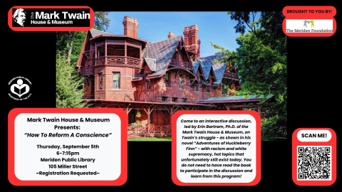 Mark Twain described Adventures of Huckleberry Finn as “a book of mine where a sound heart and a deformed conscience come into collision and conscience suffers defeat.” “How to Reform a Conscience,” a 75-minute discussion led by Erin Bartram, Ph.D., of the Mark Twain House & Museum, discusses how Twain came to recognize the way his own conscience was “deformed” with regard to racism and white supremacy, and explores the ways he successfully – and not so successfully – worked to reform it. Dr. Bartram will examine writings, from both Mark Twain and his contemporaries, about these timely topics that unfortunately still exist today. You do not need to have read the book to participate in the discussion and learn from this program!