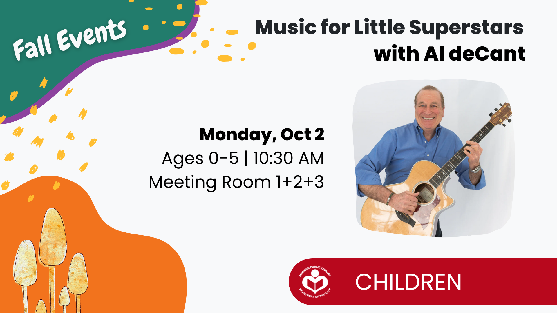 Join Al deCant, the singing principal, for a music and movement class that supports your little superstar's gross motor skills, language skills, and imagination. Children and their caregivers will sing, clap, dance, march, and see a variety of musical instruments. Siblings are welcome.