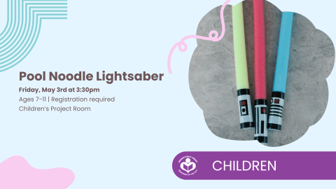 Create your very own pool noodle light saber. Participants will use part of a pool noodle, duck tape, scissors, and stickers at this event.