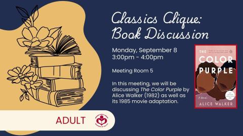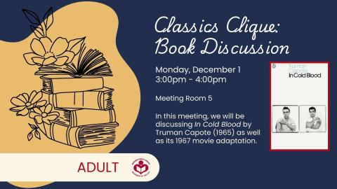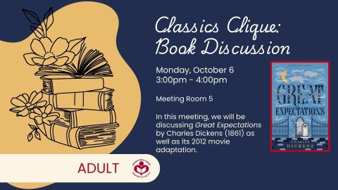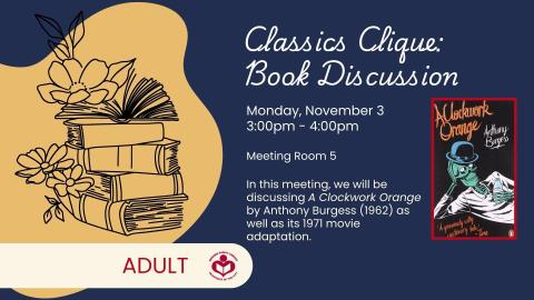 This event is in the "Adults" group Classics Clique Discussion Monday, May 4, 2026 at 3:00pm - 4:00pm Meeting Room 5 at Meriden Public Library Program Type: Book Club Age Group: Adults This club is for people who love classics, or who just want to try reading more of them. There will be a group book to read every month, as well as a viewing of the movie adaptation. Upcoming View Details Registration Required This event is in the "Adults" group May 4 2026 Mon Classics Clique Discussion 3:00pm–4:00pm Adults Upcoming Library Branch: Meriden Public Library Room: Meeting Room 5 Age Group: Adults Program Type: Book Club Registration Required Event Details: This club is for people who love classics, or who just want to try reading more of them. There will be a group book to read every month, as well as a viewing of the movie adaptation.