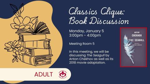 This event is in the "Adults" group Classics Clique Discussion Monday, January 5, 2026 at 3:00pm - 4:00pm Meeting Room 5 at Meriden Public Library Program Type: Book Club, Film Age Group: Adults This club is for people who love classics, or who just want to try reading more of them. There will be a group book to read every month, as well as a viewing of the movie adaptation. Open Register Now Registration Required This event is in the "Adults" group Jan 5 2026 Mon Classics Clique Discussion 3:00pm–4:00pm Adults Open Library Branch: Meriden Public Library Room: Meeting Room 5 Age Group: Adults Program Type: Book Club, Film Registration Required Event Details: This club is for people who love classics, or who just want to try reading more of them. There will be a group book to read every month, as well as a viewing of the movie adaptation.