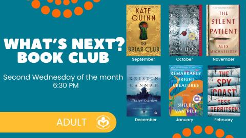 This event is in the "Adults" group What's Next? Book Club Wednesday, January 14, 2026 at 6:30pm - 8:00pm Meeting Room 5 at Meriden Public Library Program Type: Book Club Age Group: Adults Remarkably Bright Creatures by Shelby Van PeltA charming, witty and compulsively readable exploration of friendship, reckoning, and hope that traces a widow's unlikely connection with a giant Pacific octopus. Open Register Now Registration Required This event is in the "Adults" group Jan 14 2026 Wed What's Next? Book Club 6:30pm–8:00pm Adults Open Library Branch: Meriden Public Library Room: Meeting Room 5 Age Group: Adults Program Type: Book Club Registration Required Event Details: Remarkably Bright Creatures by Shelby Van PeltA charming, witty and compulsively readable exploration of friendship, reckoning, and hope that traces a widow's unlikely connection with a giant Pacific octopus.