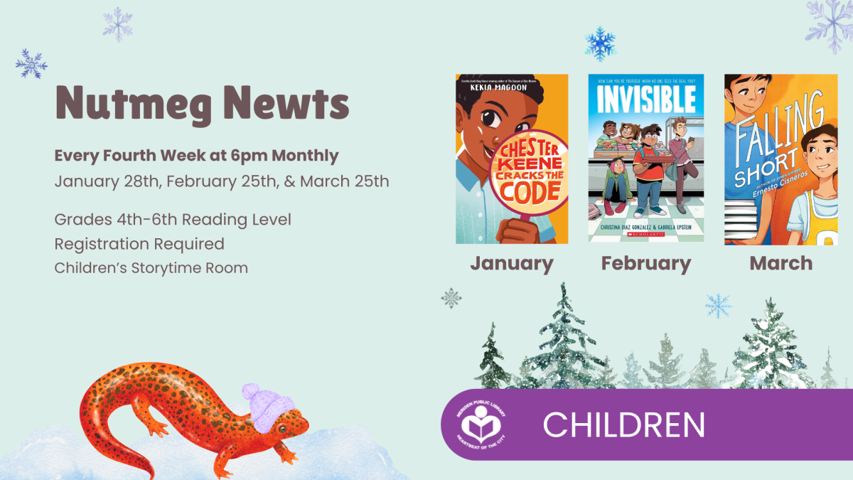 Nutmeg Newt book covers to right of verbiage with a salamander below